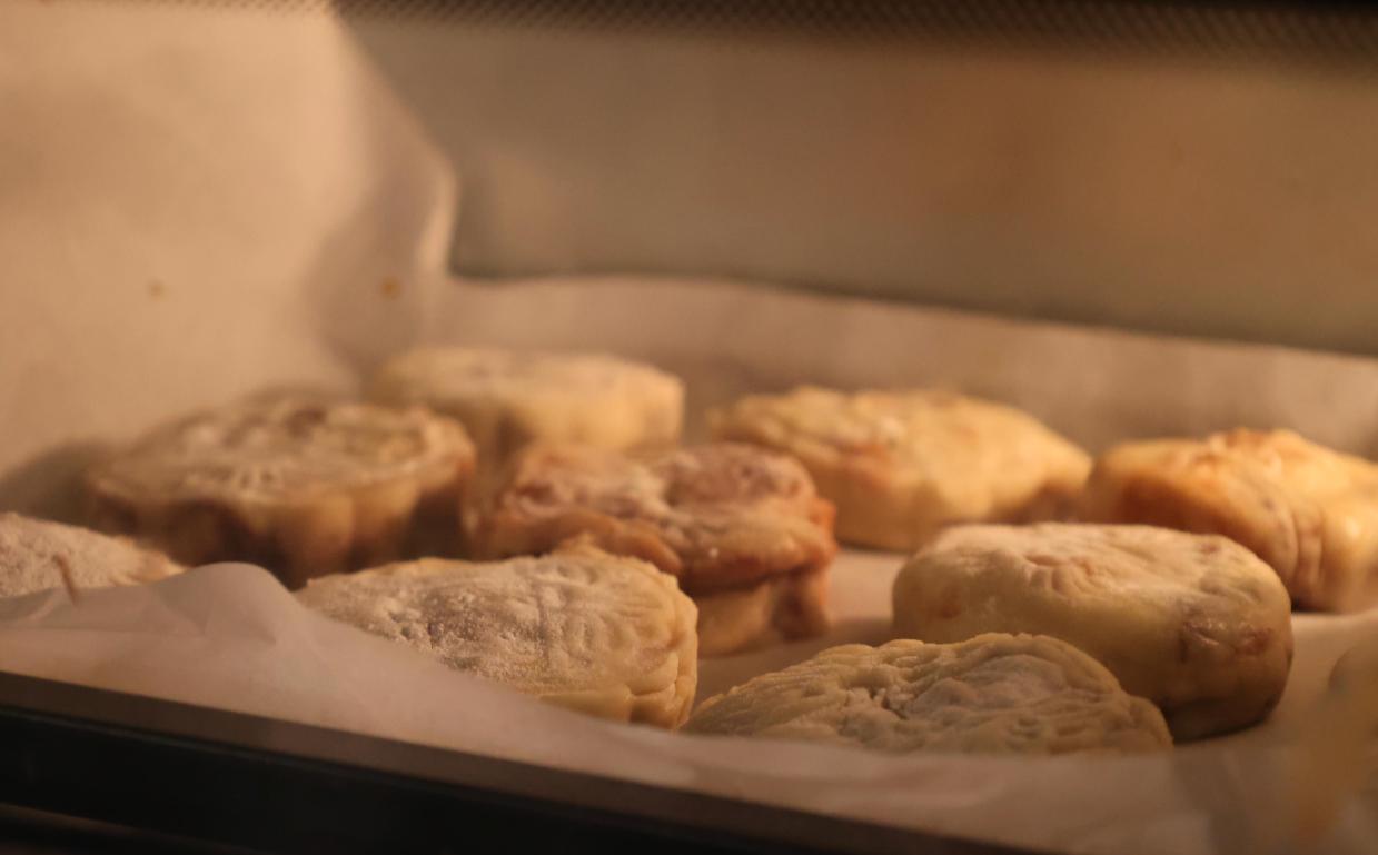 将准备好的面皮和馅料包好,用不同样式的模具压制成形,然后送入烤箱进行烘烤,一个个油香四溢、外观精致的月饼就新鲜出炉啦!