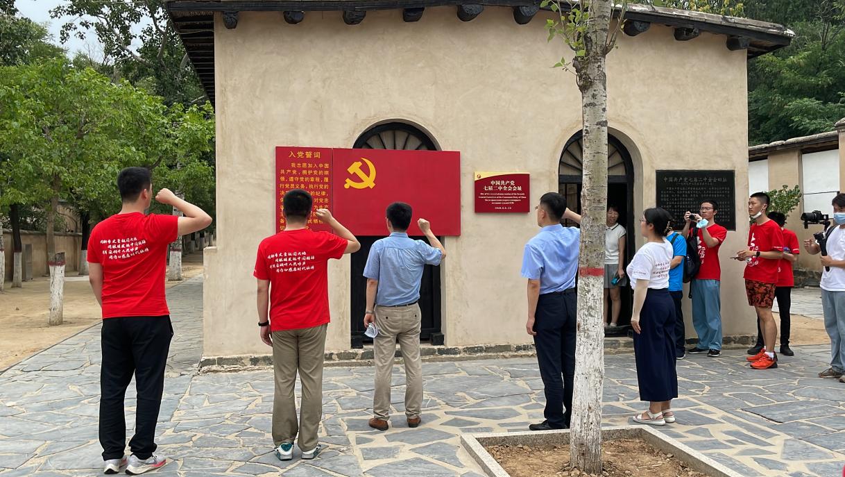 在七届二中全会会址前,侯士敏院长带领党员师生们共同重温入党誓词。他们宣誓时的坚毅与激情,深深感染着同学们不断追求进步、做出更大贡献的爱党爱国信念。