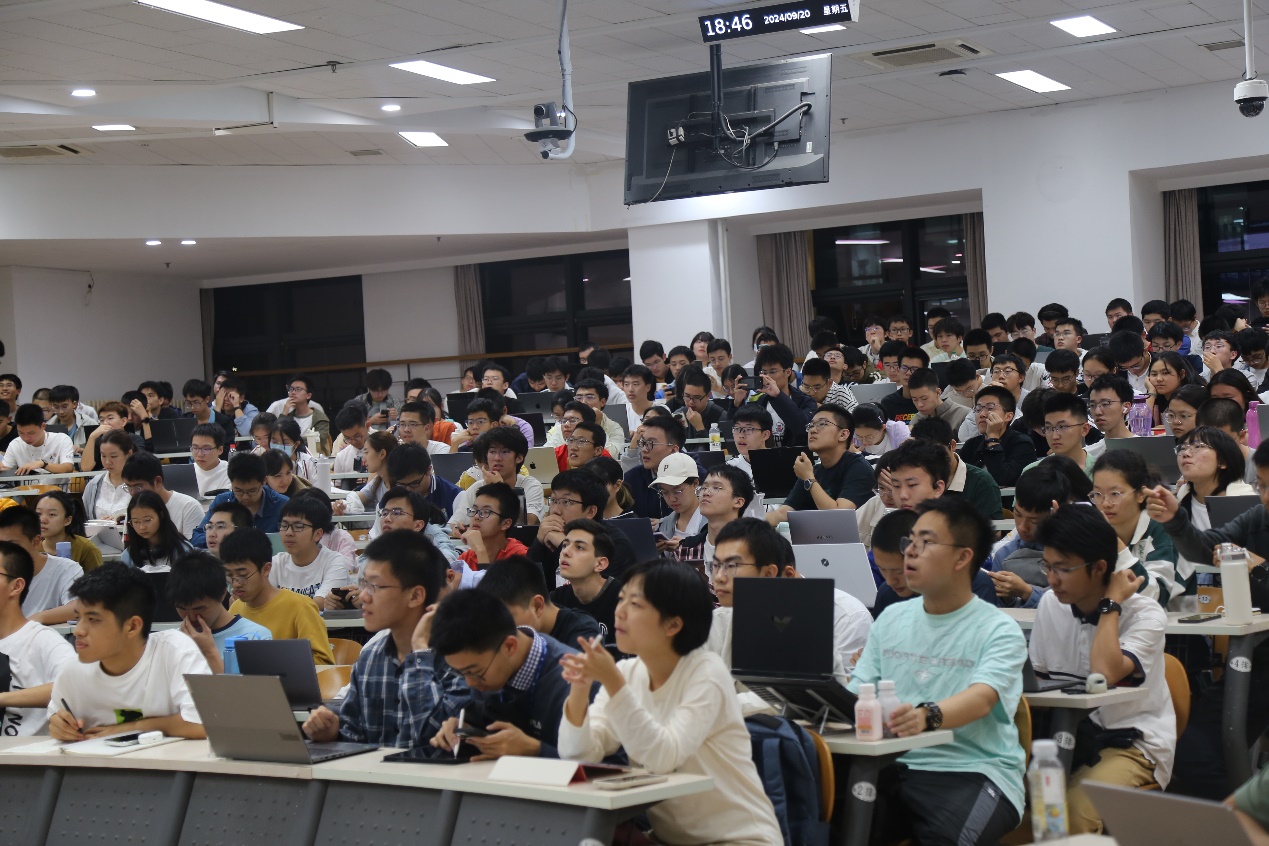 在问答环节,同学们积极踊跃地向赖梁祯博士提问,赖梁祯博士一一作出答复。有同学提出“硬件/软件哪个对人工智能制约更大”的问题,赖博士举了TPU的某款芯片,刚进入系统和迭代到下一次时,性能提高了两倍,以及大模型在过去几年内主要的变化还是模型变大、参数变多的例子,总结并答复道“二者都非常重要,要从一个更系统的角度去看待这个问题”。