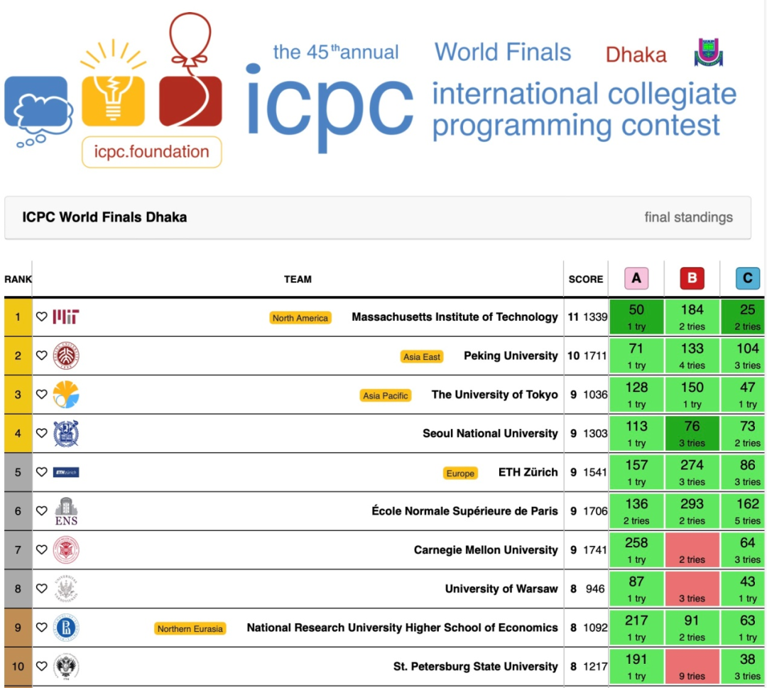 决赛的前两个小时,赛程并非一帆风顺。他们花了48分钟才通过了第一道题目,而对手麻省理工学院队在第50分钟时就已经通过了四道题目。大比分落后的情况下,成员们并没有气馁,他们互相鼓励,调整好心态。在落后第一名三道题的情况下,仍然发挥了最好的水平,并以第二名的好成绩摘得金牌。