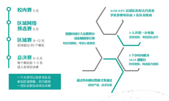ICPC的形式为团队合作,每支队伍由三名队员组成,代表学校参赛。比赛期间,三名参赛队员共用一台电脑,需要在5个小时内使用C/C++、Java和Python中的任意一种计算机语言编写程序解决10道左右的问题,正确答题数量最多且总用时最少的队伍获得优胜。时间短,题量大。另外,一支队伍3名队员只有1台电脑,因此除了扎实的专业水平,良好的团队协作和心理素质同样是获胜的关键。