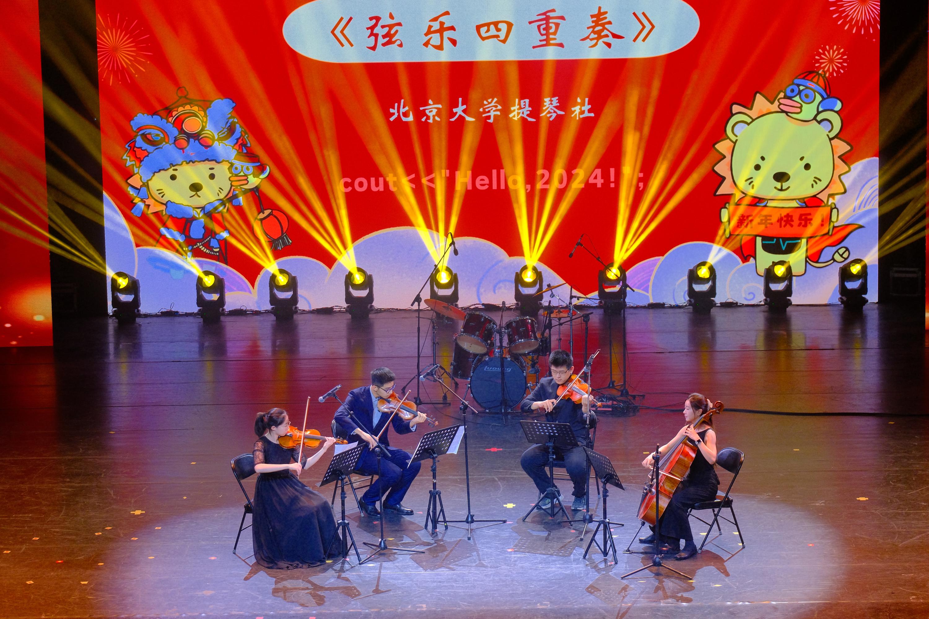 本场晚会还邀请到魔术明星和校内各个社团为晚会助阵。提琴社同学的《弦乐四重奏》以悠扬的弦乐声带领现场观众步入古典之美。风雷街舞社带来的舞蹈串烧《Love Nwantiti》将多元的音乐舞蹈风格巧妙融合,以蓬勃的朝气点燃了现场观众的热情。Paca人声乐团带来的阿卡贝拉《幸福快车》以温暖的旋律,为每一位到场的观众送上了诚挚的新年祝福。魔术师辛冠杰则带来了精心准备的魔术《心灵骇客》,表演巧妙地将“Hello world”、攻城狮等信科元素与精彩的魔术结合,现场掌声连连。由北大剧社基于同名游戏改编的短剧《隐形守护者》以惟妙惟肖的表演,展现动荡年代中潜伏者的奉献与牺牲。汉服社同学带来走秀《花朝》,以美轮美奂的表演带领现场观众进入百花盛开的时空,感受生机与活力,展现出新青年的文化自信。越剧协会带来的越剧表演《越鱼·书馆》以动听的吴侬软语和优美灵动的唱腔呈现了一个动人的爱情故事。北大舞团带来舞蹈《Another Day of Sun》,爱乐之城中的经典舞步在舞台上再现,欢愉又青春,温暖而热烈,为晚会画上了圆满的句号。