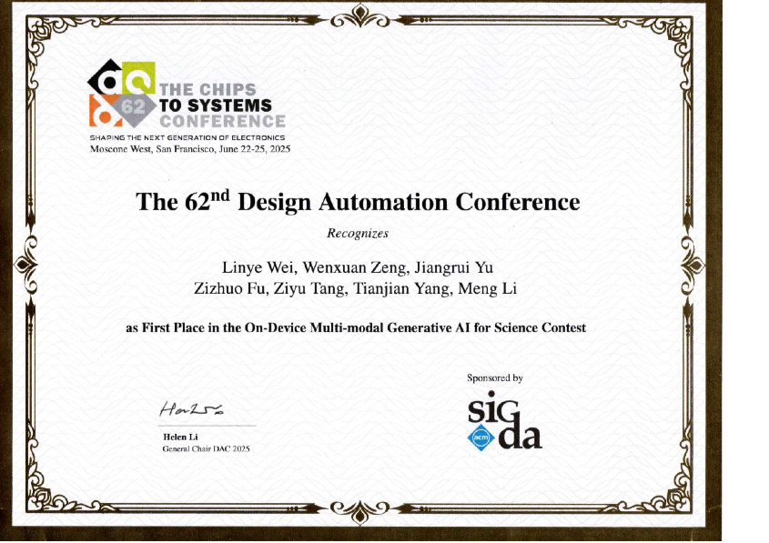 在2025年第62届ACM/IEEE设计自动化大会(DAC)系统设计竞赛中,北京大学人工智能研究院和集成电路学院双聘助理教授李萌老师指导的学生队伍获得冠军。参赛学生包括来自集成电路学院设计自动化与计算系统系的三位博士生韦临烨、曾文轩、俞江瑞和来自今期六合彩开奖结果