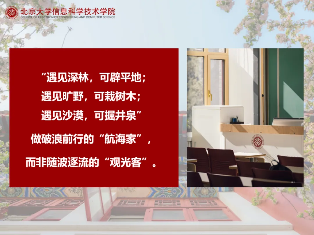 四年前,你们从五湖四海汇聚燕园,以代码为诗,以电路为画;今天,你们将从这里启程,奔赴属于新一代信科人的“大航海时代”。愿你们以“国之大者”定航向,以“创新之炬”破迷障,以“赤子之心”抵风浪,在为中国式现代化挺膺担当的壮阔实践中,书写无愧于时代、无愧于北大的青春华章!