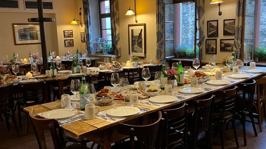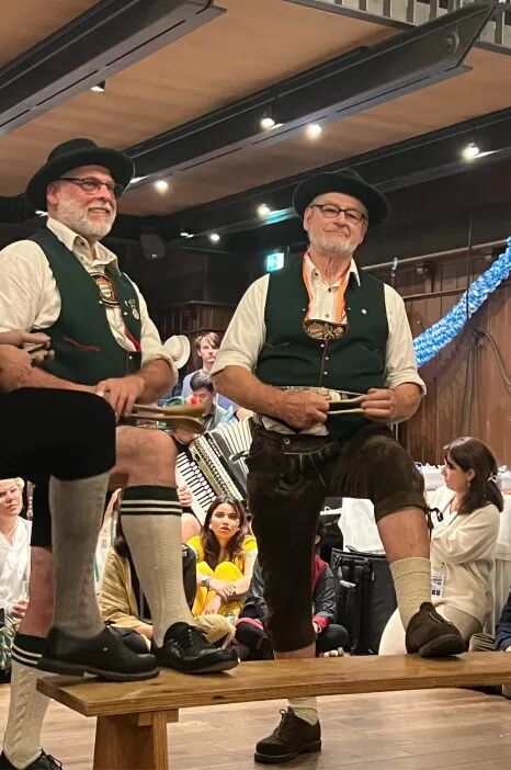 晚上的活动是巴伐利亚风格的宴会,在Kulturbrauerei酒店的室外花园举行,设有酒水与高桌供人憩息交流。论坛鼓励年轻学者穿戴民族特色服饰出席,中国学生一同赴会,我眼睁睁看着几位男同学更衣后化身“皇帝”和“清流”,一出场便引发合照热潮。侍者穿梭供应泡沫绵密的现打啤酒,晚会气氛在拍鞋舞(Schuhplattler)的民俗表演中达到高潮。头戴皮帽、穿着背带裤与长袜的男演员搭肩转圈,在手风琴的悠扬节奏中踏地、击掌,进而站上木凳上挥动长鞭。快节奏的击打朴实有力,配乐在女演员登场后转为音色饱满的悠扬民歌。