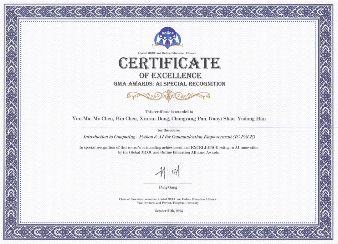 “AI特别奖”旨在表彰在教学中创新应用AI技术、利用AI改变学习体验的优秀课程。2025年,来自14个国家的课程入围评选,最终仅10门课程获此殊荣。北京大学IC-PACE课程是本届唯一具有人文社科背景的获奖项目,体现了北京大学在文理交叉、AI赋能高等教育及新文科建设方面的领先地位。