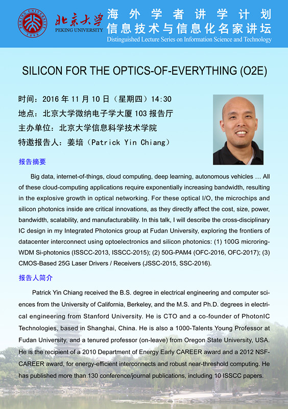 Patrick Yin Chiang received the B.S. degree in electrical engineering and computer sciences from the University of California, Berkeley, and the M.S. and Ph.D. degrees in electrical engineering from Stanford University. He is CTO and a co-founder of PhotonIC Technologies, based in Shanghai, China. He is also a 1000-Talents Young Professor at Fudan University, and a tenured professor (on-leave) from Oregon State University, USA. He is the recipient of a 2010 Department of Energy Early CAREER award and a 2012 NSF-CAREER award, for energy-efficient interconnects and robust near-threshold computing. He has published more than 130 conference/journal publications, including 10 ISSCC papers.